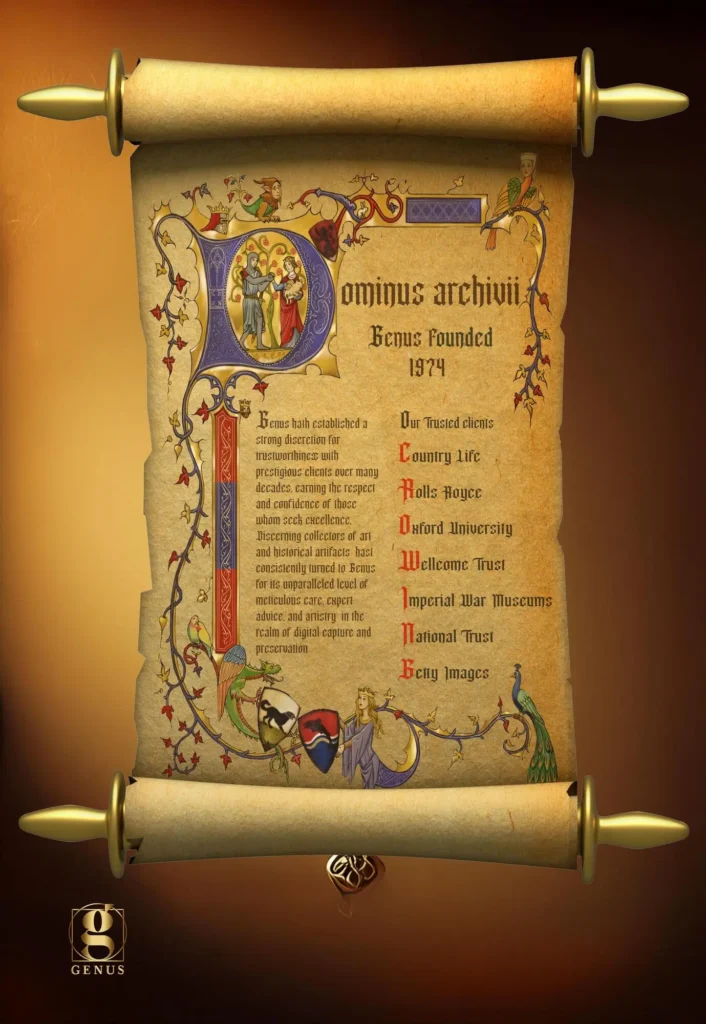 Genus has earned a heritage of trust with prestigious clients over many decades. Discerning collectors of art and historical artefacts have relied on Genus’s meticulous care, expert advice and artistry for their digital capture and preservation projects in their custody.