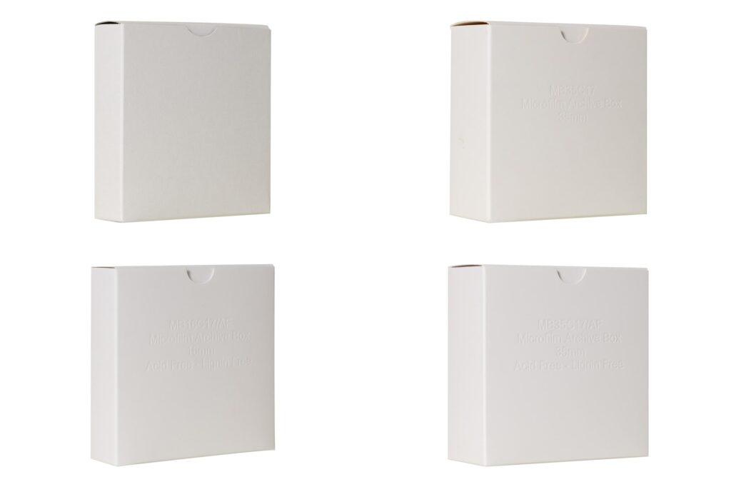 An acid-free cardboard film box for 35mm film. Available in white. A range of labels is also available.