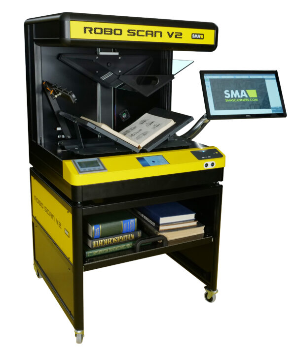 The SMA ROBO SCAN V2 is a groundbreaking 3-in-1 scanning solution that combines both robotic and manual scanning capabilities in one unit. With its versatile V-Shape Cradle, the scanner can perform V-Shape scanning robotically or manually (with or without glass), as well as flat scanning manually (without glass). This flexibility allows for the scanning of a wide variety of materials, from books to maps, photographs, and other flat originals. The ROBO SCAN V2 features V3D technology, which enhances the depth of field and ensures perfect digital reproductions. Designed for high productivity, it can operate autonomously with its robotic arm for page turning, or it can be switched to manual mode for delicate or rare originals. The scanner’s illumination system is LED-based and free from UV and IR radiation, ensuring uniform and harmless lighting during the scanning process.